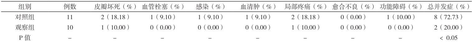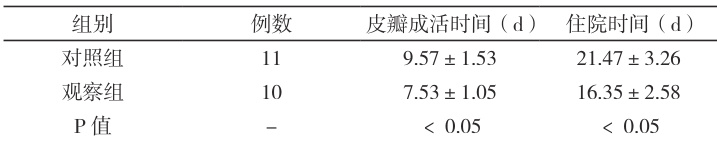 实验收入样本均为我院 2023 年 6 月至 2024 年 12 月期间收治皮瓣移植患者,共计人数 21 例,以电脑随机分组方式作为标准,将参与者分为两组,对照组人数11 例,观察组人数10 例,年龄区间涉及:(20-75)岁,平均值: 47.50±3.20 )岁,组间基线资料 P>0.05 ,符合开展必要条件。