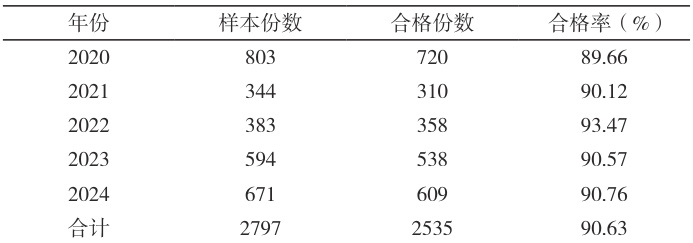 2020 ─ 2024 年共采集样本 2797 份,合格 2535 份,总合格率为90.63% 。