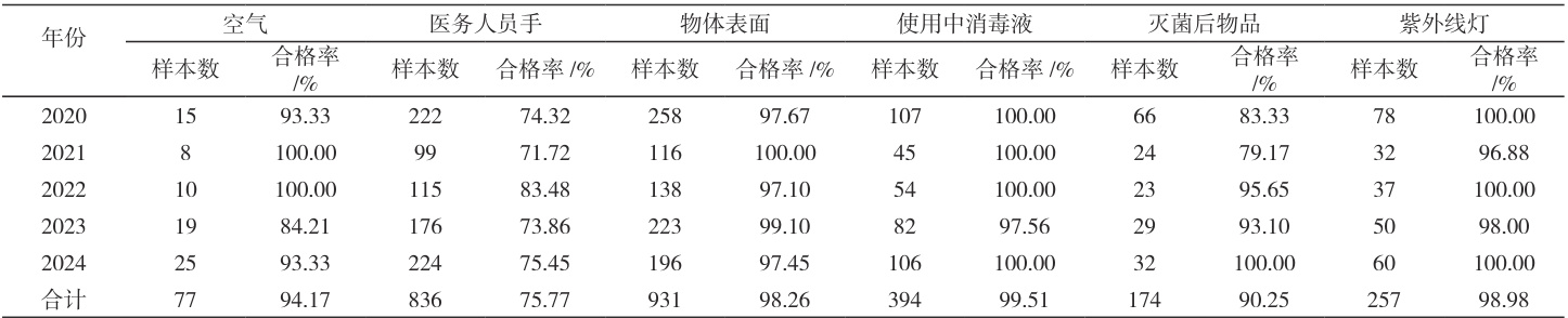 表 1 2020—2024 年甘井子区医疗机构消毒质量监测结果