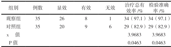 与对照组最终结果比较显示,观察组检验准确率以及最终获得的治疗总有效率更高,两组数据差异有统计学意义( P<0.05) ;见下表1。