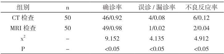 MRI 检查的确诊率偏高,误诊与漏诊率、不良反应率低于 CT 检查P<0.05 。见表1。