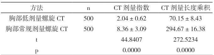 胸部低剂量螺旋 CT 剂量指数、剂量长度乘积显著更低( p<0.05 )。见表2。