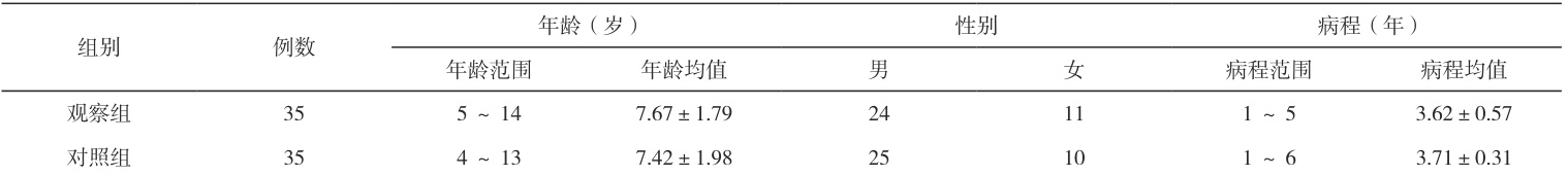 选取2023年11月30日~2024年11月30日,随机将70例变应性鼻炎患儿均分为观察和对照两组,35例/组。并严格制定了相关的标准要求,其中,纳入标准为:⑴符合相关标准确诊者;⑵患儿沟通正常,能完成研究配合者;⑶患者或家属签署自愿书者。排除标准:⑴患有主要器官疾病者;⑵不能完成研究配合者;⑶鼻窦、鼻腔有手术史者。具体分组情况详见表1。