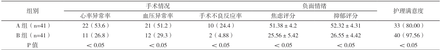 分析观察两组在心率异常率、血压异常率、手术不良反应发生率、护理满意度方面的差异表现。