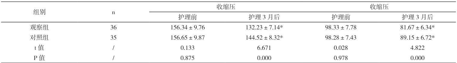 2024 年 1 月 --2025 年 1 月, 随 机 抽 样 选 取 71 例 我 社 区 收 治 的老年高血压患者,并随机分为两组;对照组(35 例)年龄 61~78 岁( 67.54±4.26 )岁,男性 20 例、女性 15 例;观察组(36 例)男性 21 例、女性 15 例,年龄 62~80 岁( 67.75±4.23 )岁。两组一般资料差异无统计学意义, P>0.05 ,具有可比性。