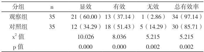 观察组总有效率 97.14% ,对照组 85.71% ( P<0.05 )。