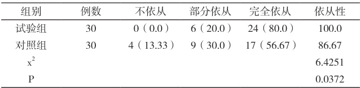 对比表1 内的依从性:试验组 100.0% ,对照组 86.67% , P<0.05AA