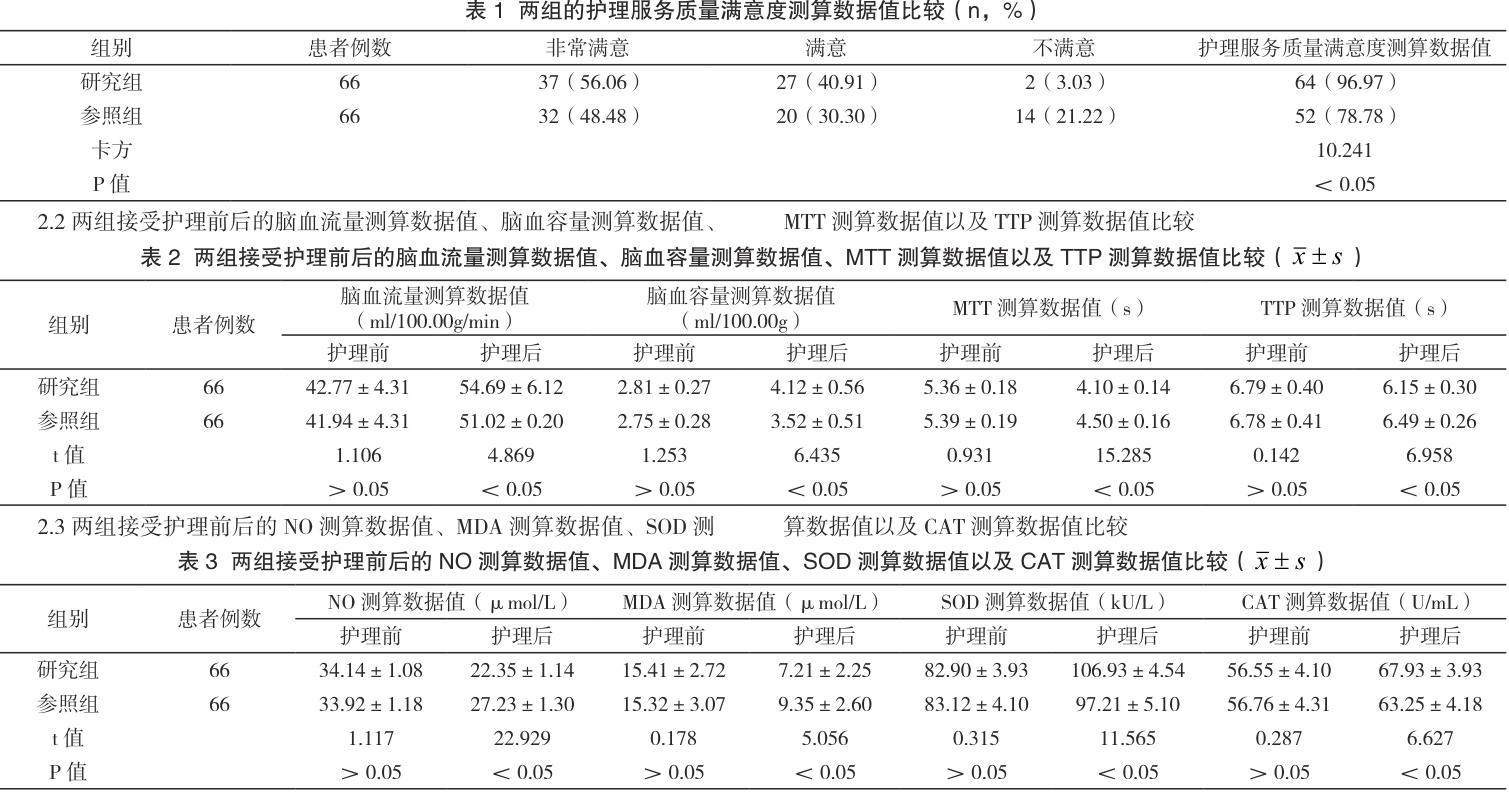 2022 年 4 月 -2025 年 2 月,将 132 例老年期血运重建术后再发缺血性脑卒中患者随机分两组,各 66 例。参照组男性 34 例,女性 32 例,年龄介于62-84 岁,平均( 73.45±2.25 )岁。研究组男性 35 例,女性31 例,年龄介于63-85 岁,平均( 73.42±2.23 )岁。两组的基线资料未见差异(P