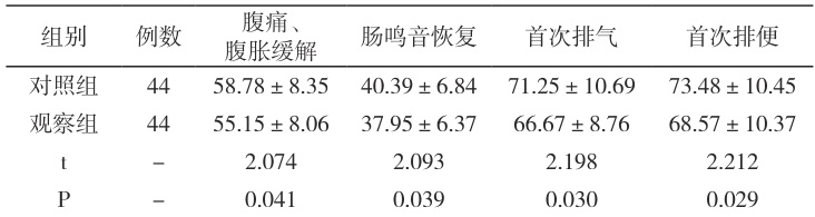 ① 症状缓解时间:腹痛、腹胀、肠鸣音恢复正常、首次排气、首次排便;② 并发症情况:低血压、消化道出血、胰腺假性囊肿等。