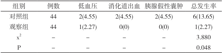 观察组仅发生 1 例,对照组共发生 6 例,前者明显较少, P=0.048 ,有统计学意义;表2 :