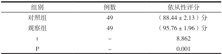 采用院内自制依从性量表评定,分数越高依从性越好。