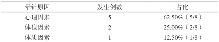 本研究中未发现因单纯疼痛因素导致晕针的患者,但在部分晕针患者中,疼痛可能起到了一定的诱发作用。本研究中 8 例患者晕针原因分析情况见表1。