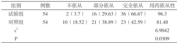 2.1 用药依从性分析表1 内的用药依从性:试验组 96.3% ,对照组 81.48% , P<0.05