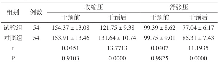 表2 内的血压:未干预,差异不显著( P>0.05 );干预后:试验组更低( P<0.05 )。