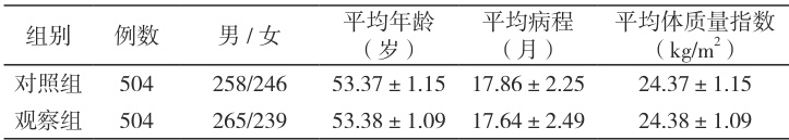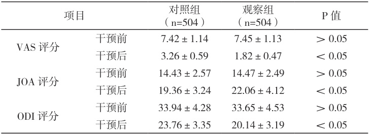 随机选取 2023 年 1 月 1 日 -2024 年 12 月 31 日期间收治的的 1008 例腰椎间盘突出症患者(腰椎间盘突出 633 例 / 腰椎间盘突出伴坐骨神经痛367 例 / 腰痛伴有坐骨神经痛 8 例),严格遵循随机化的统计学原则将所有患者平均分成对照组和观察组,患者均符合《腰椎间盘突出症诊疗指南》[4]诊断标准,经 X 线、CT 椎间盘扫描以及肌电图检查确诊。排除中枢神经损伤引起的腰腿痛、后纵韧带、侧韧带松弛、腰椎失稳者,妊娠和哺乳期妇女,2 周内应用过相关药物治疗者,合并恶性肿瘤、过度的骨质增生者或纤维环韧带钙化较严重者,心肾功能障碍及免疫系统疾病和有认知、语言功能障碍、精神疾病史者,皮肤破损者、重要器官功能障碍者,以上基础资料均衡可比, P>0.05 。