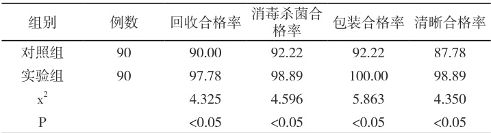 实验组在对照组的基础上结合质量敏感指标干预。具体内容: ① 明确质量敏感指标。根据 CSSD 护理管理指南、相关规范确定质量敏感指标,包括回收完整性、消毒生物监测合格率、包装规范率、湿包率等。 ② 分析。结合以往工作经验和 CSSD 实际情况,分析可能影响质量敏感指标的因素和原因,讨论措施。 ③ 数据采集。专人每日记录指标数据并录入数据库。④ 加强质量管理。基于数据波动调整流程(如优化灭菌参数),调动 CSSD组员的工作积极性,强化其工作能力和工作重点。 ⑤ 多维度评估。根据器械合格率、护士操作依从性、临床科室反馈综合评价护理质量。