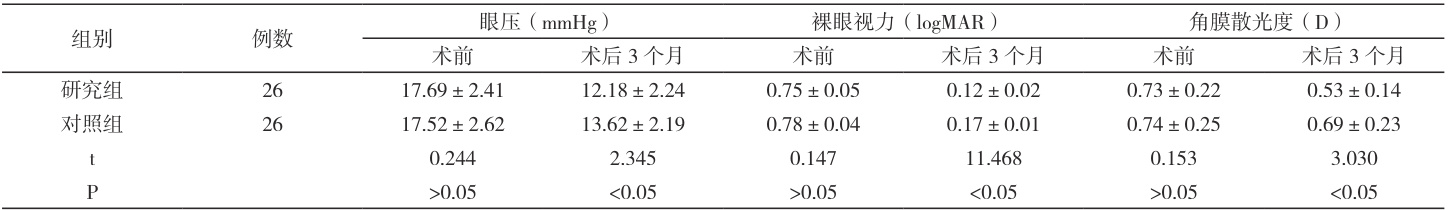 术前,两组眼压、裸眼视力、角膜散光度均无明显差异( P>0.05 );术后3 个月,研究组各指标数值均比对照组优( P<0.05 )。见表 1