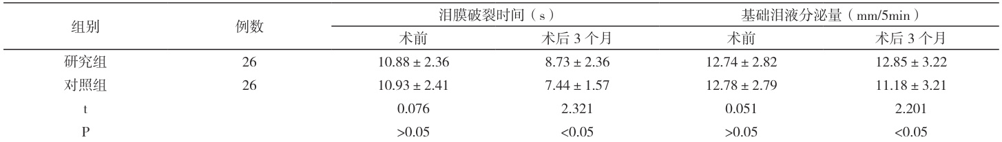 术前,两组泪膜破裂时间、基础泪液分泌量均无明显差异