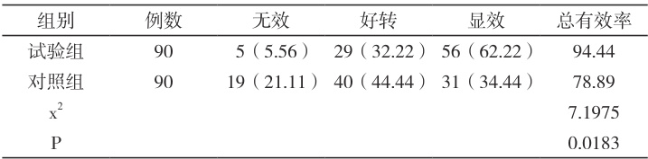 对比表2 内的总有效率:试验组 94.44% ,对照组 78.89% , P<0.05AA