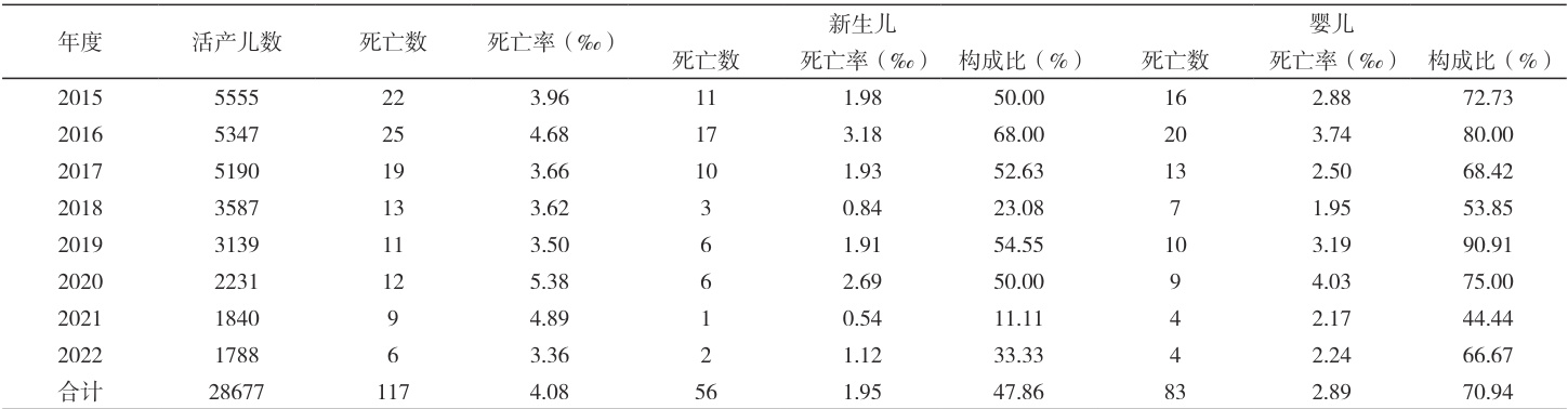 表1 2015-2022 年上海市青浦区5 岁以下儿童死亡动态变化表