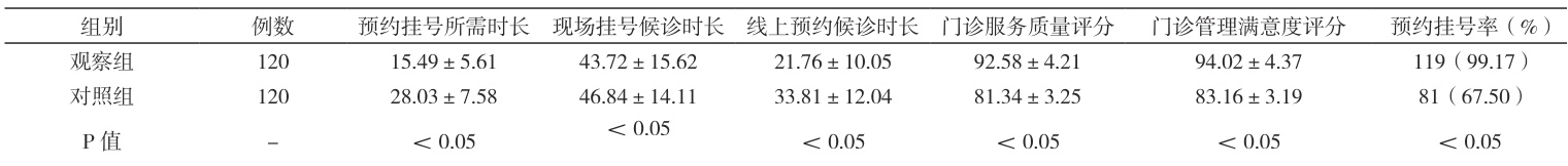 观察组:1)组织开展培训活动,学习目标化管理概念及理论知识,优化整体人员职业能力及责任意识;围绕现阶段门诊预约服务工作现在进行讨论,整理归纳管理过程中存在弊端,以解决问题为目标制定科学管理方案 [2]。2)建立阶段性管理考核目标,并进行任务分配,实现合理分配号源,提高就诊效率效果,优化工作内容作用 [3]。3)科学调整线上、线下号源,结合门诊医生具体情况科学规划预约时间,并适当缩短时间,确保开放号源增加。4)在门诊大厅内清晰标注预约就诊流程,工作窗口粘贴相关标识;规划轮班制度,使门诊大厅导诊人员充足;指导患者使用智能设备,引导患者完成挂号操作,详细讲解线上预约挂号流程,并帮助患者完成号源咨询等工作 [4]。5)向患者发放线上预约渠道相关资料,帮助患者深度了解预约服务优势;简化线上预约操作流程,并在预约成功后以电话形式进行回访,提醒患者就诊[5]。