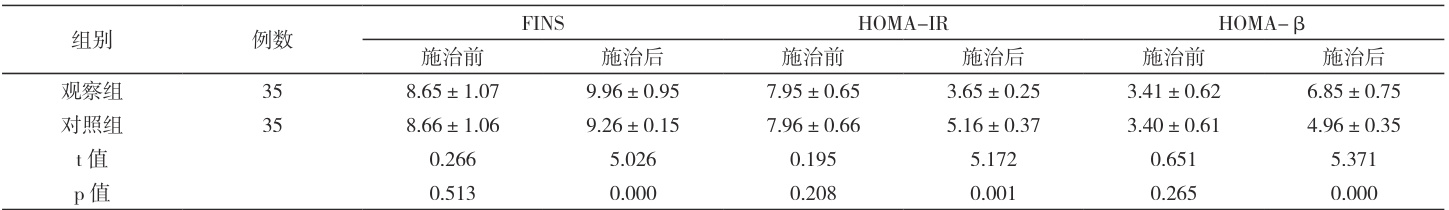 施治前 FINS、HOMA-IR、HOMA- β 2 组平行比较差异微小 P> 0.05,施治后与对照组做平行对比 FINS、HOMA- β 均为观察组更高,HOMA-IR 为观察组较低 P<0.05, 。