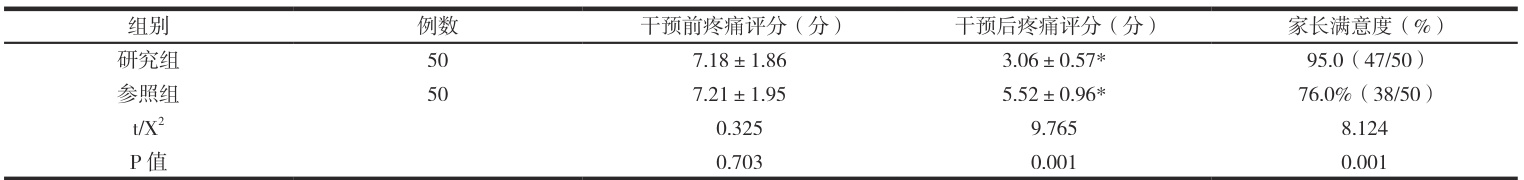 如表1所示,干预前两组患儿的疼痛评分相比无较大差异( P>0.05 );干预后两组均有所降低,研究组低于干预前和参照组,有显著差异和统计学意义( P<0.05 )。家长满意度比较,研究组高于参照制度( P<0.05⋅ )。