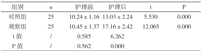 观察组护理后高于对照组, P<0.05 ,详见表 1。