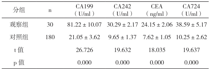 观察组的 CA199、CA242、CEA、CA724 水平均高于对照组(P<0.05) 。