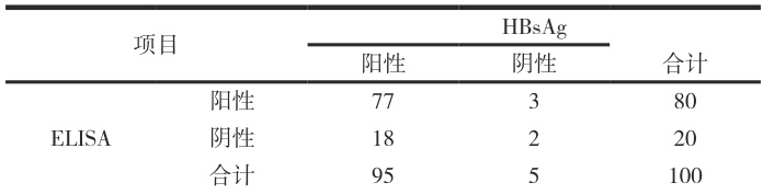 选取 2021 年 1 月至 2023 年 12 月期间某三级甲等医院收治的 100例疑似HBV感染患者,其中男性80例,女性20例,年龄范围为18-65岁。受检者均接受ECLIA 与ELISA,并将检验结果与 HBsAg 进行对比。
