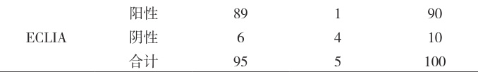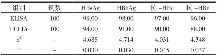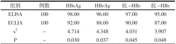 ECLIA 检验在 HBsAg、 HBeAg 、抗 -HBc、抗 -HBe 方面的灵敏度更高( P<0.05 ),详见表2。