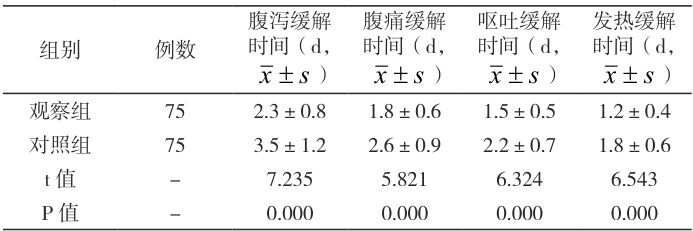 记录两组患儿腹泻、腹痛、呕吐、发热等症状缓解时间,腹泻缓解标准为每日排便次数 ⩽2 次且粪便性状恢复正常;腹痛缓解标准为患儿自述腹痛消失或无哭闹、拒按等表现;呕吐缓解标准为停止呕吐 ⩾24 小时;发热缓解标准为体温恢复正常(腋温 <37.3∘C )且持续⩾24 小时。