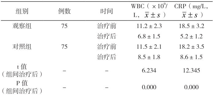 治疗前,两组患儿 WBC、CRP 水平比较,差异无统计学意义( P>0.05 );治疗7 天后,两组患儿WBC、CRP 水平均较治疗前显著降低( P<0.05 ),且观察组患儿 WBC、CRP 水平显著低于对照组,差异有统计学意义( P<0.05⋅ )。具体数据见表2。