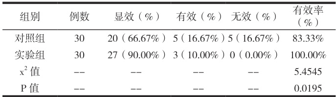 2023.02-2025.02 期间,研究对象包括本院收治的 60 名存在术后残余感染的急性阑尾炎患者,对以上患者进行人员随机分配,对照组(患者 30 人)甲硝唑治疗,实验组(患者 30 人)左氧氟沙星联合甲硝唑治疗。