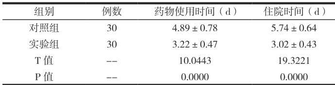 实验组药物使用时间、住院时间短于对照组, P<0.05