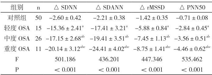 OSA 组在△ SDNN、△ SDANN、△ rMSSD、△ PNN50 均高于对照组( ΔPℓ<0.05 ),同时随着 OSA 严重程度增加,HRV 各项指标日夜间差值绝对值显著增大( P<0.05 ),见表 1 。