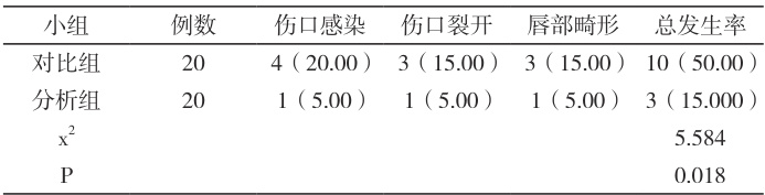 分析组( n=20 延续护理 ):(1)健康教育:向患儿及家属讲解疾病知识,强调治疗长期性,增强配合意识。(2)并发症护理:并发症护理:护理人员需要密切观察患儿, 及时发现并积极处理。对于皮瓣裂开的患儿 , 可采取再次缝合或植皮等措施 ; 对于感染 , 则需要使用抗生素等药物进行治疗。同时加强术后伤口护理 , 保持创面清洁干燥 , 避免过度活动, 都有助于预防这些并发症的发生。(3)康复训练:定制个性化方案,吞咽训练从简到繁,结合多感官刺激;发音训练从元音开始,借助感官反馈纠正;口腔功能训练由基础进阶,用玩具增强趣味,锻炼肌肉能力。(4)心理护理:沟通了解患儿及家属负面情绪,评估应对能力与社会支持,针对性心理辅导,主动关怀倾听,给予情感支持。(5)出院后随访: ① 电话随访:出院1 周内首次随访,了解患儿情况,解答疑问,提醒复诊。之后每 2 周 1 次至术后 3 个月,每月 1 次至术后1 年。 ② 家庭访视:出院1 个月首次访视,查看患儿恢复及训练情况,评估居住环境,纠正训练方法,面对面沟通解决问题。之后每 3 个月1 次至术后 1 年。 ③ 网络平台随访:建立唇腭裂术后患儿微信群或 QQ群,定期发布术后护理知识、康复训练方法和注意事项等,鼓励患儿家属在群内交流经验,分享康复心得。护理人员及时回复患儿家属在群内提出的问题,提供在线指导和帮助。