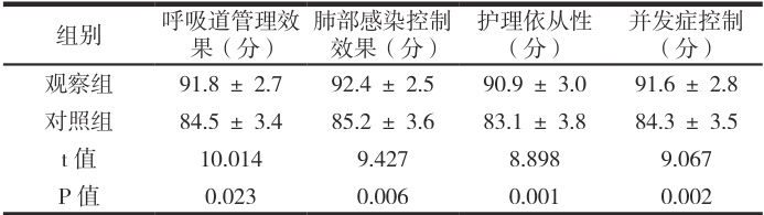 观察组在呼吸道管理效果、肺部感染控制、护理依从性及并发症控制方面得分均显著优于对照组( P<0.05 ),见表1。