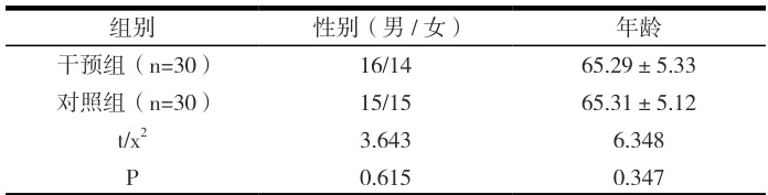 研究时间为 2023 年 5 月至 2025 年 5 月,选取 60 例慢阻肺稳定期患者作为研究对象,随机分为干预组和对照组各 30 例。两组一般资料见表 1,两组一般资料对比无明显差异( P>0.05 )。本研究符合赫尔辛基宣言。