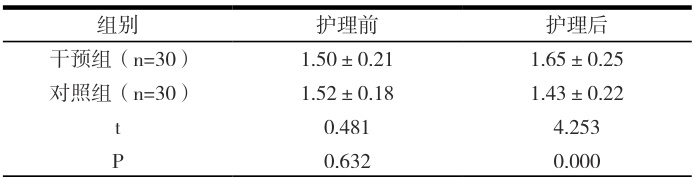 预组护理后FEV1 为显著高于对照组( P<0.05 ),见表2。