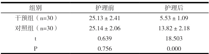 表3 两组患者护理前后CAT 总分对比(x ± s , 分)