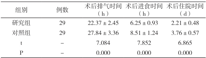 1.3.1 术后康复效果。包括术后排气时间、术后进食时间、总住院时间等。