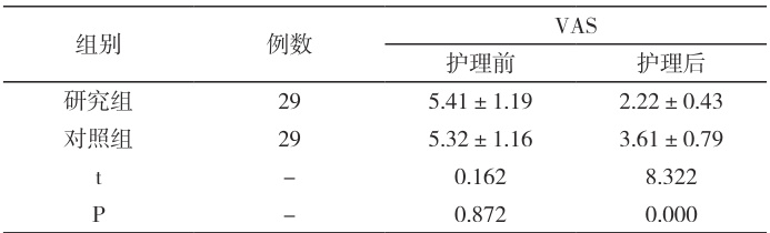 1.3.2 疼 痛 程 度。 使 用 视 觉 模 拟 评 分 法(Visual Analogue Scale/Score,VAS)分析患者术后疼痛程度,分数越高,患者疼痛程度越高。