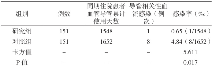 结果显示,研究组的感染率为 0.65‰ ,对照组为 4.84%o0 通过卡方检验,卡方值为 5.611,P 值为 0.017,说明两组的感染发生率差异有统计学意义( P<0.05 )。