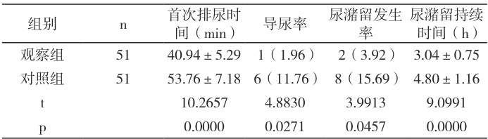 观察组首次排尿时间更短,导尿率与尿潴留发生率更低,尿潴留持续时间更短,p 均 <0.05 ,见表 1。
