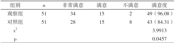 观察组护理满意度更高, p<0.05 ,见表 2