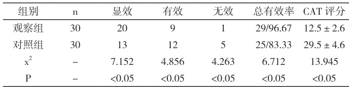 生活质量评分:采用慢性阻塞性肺疾病评估测试(CAT)量表进行评估,该量表包含咳嗽、咳痰、胸闷、活动能力、睡眠等 8 个维度,总分40 分,分数越高表明患者生活质量越差。