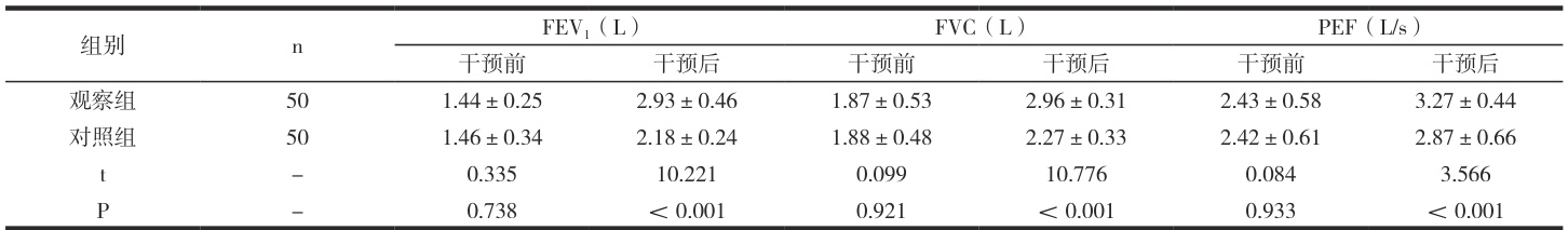 干预前,两组肺功能指标无统计学差异( P>0.05 ),干预后,观察组肺功能指标优于对照组( P<0.05 )。见表 2