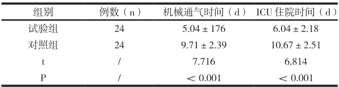 试验组患者机械通气时间和 ICU 住院时间均较对照组短,差异明显( P<0.05 )。如表1.