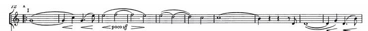 这种文学叙事在音乐中的映射呈现出精确的对应关系。例如谱例一,固定乐思首次以 c 大调呈示时长笛独奏,连贯的连音线条,明亮的调性与流畅的旋律直接对应内心的狂喜;